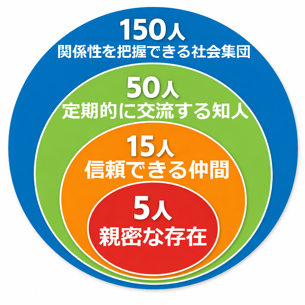 ダンバー数(Dunbar’s number)とは、人が安定した社会的関係を維持できる人数には上限があり、その目安は約150人であるとする仮説です。