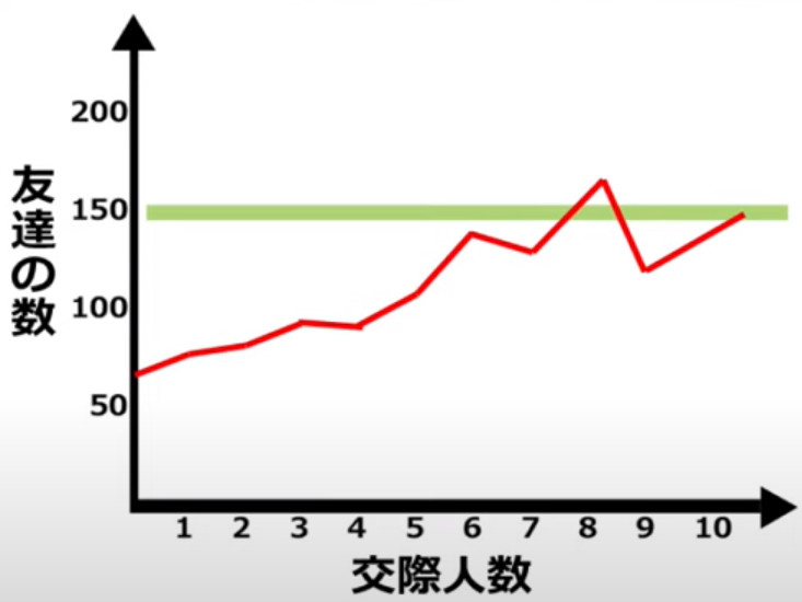 この図をみると、友達の数が増えるに従って交際人数も増えていますが、友達の数がダンバー数150人に達した後は頭打ちになっています