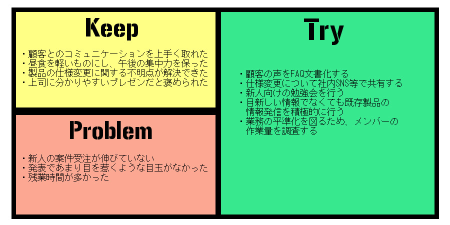 「Keep」をより強化するような挑戦、そして「Problem」を改善するような新たな挑戦を書き加えます。具体的な行動を書くことで、今後何をすべきなのかを明らかにします。