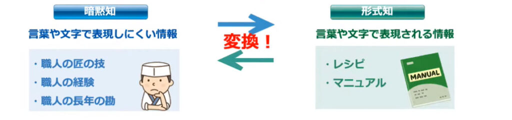 また、マニュアルやレシピなど、言葉や文章で表現される情報のことを形式知と言います。