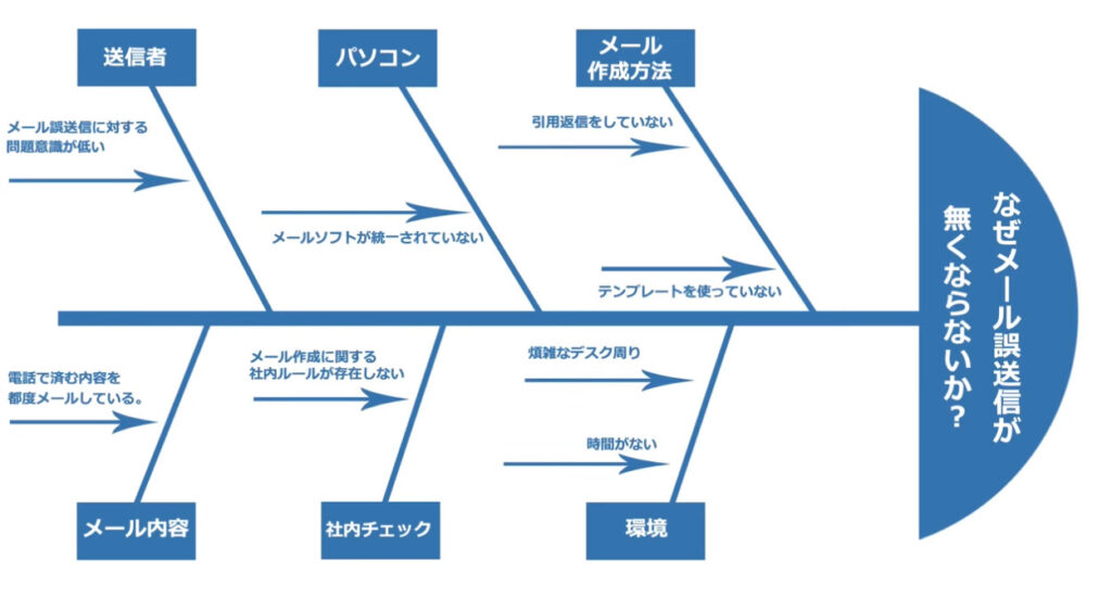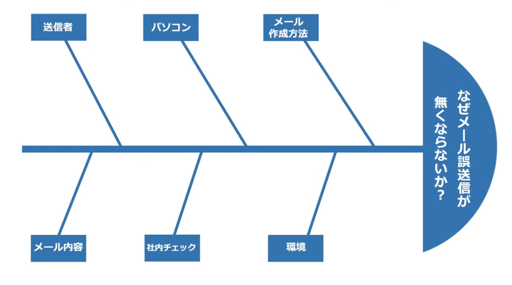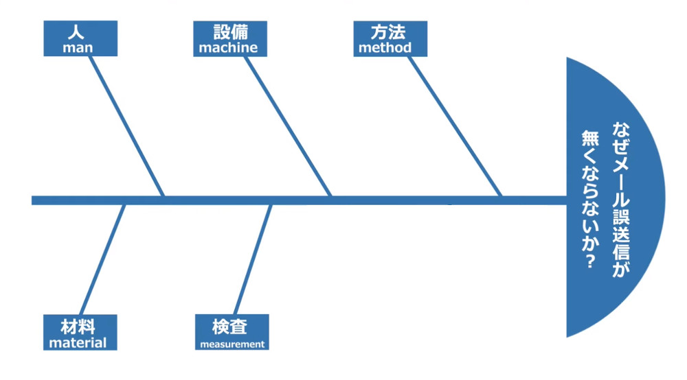 この時、パッと思いつくものを書いても構いませんが、品質管理などの現場では「5M」(人、設備、材料、方法、検査)を大骨に書き込む要因にすることが多くみられます。