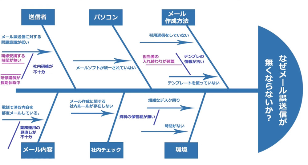 フィッシュボーン・ダイアグラムでは、そのような問題の根本原因をあぶり出し、整理・分析をすることができます。