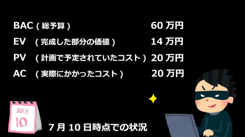 それではPV(計画で予定されていたコスト)はどうでしょうか。当初計画では7月10日までの10日間に必要とされる人件費は20万円でした。