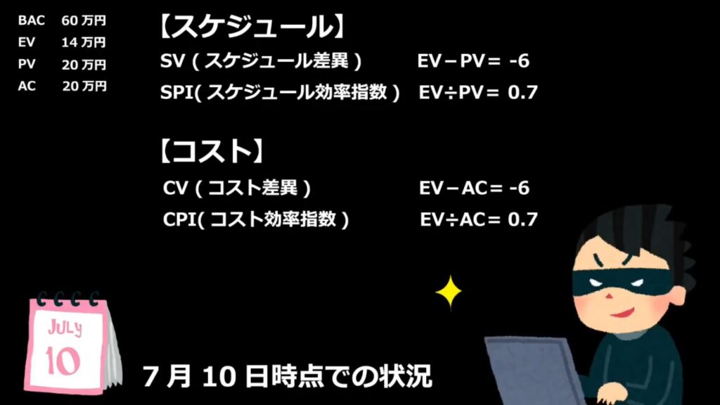 AC(実際にかかったコスト)も、7月10日までの10日間にかかった人件費は20万円になります。