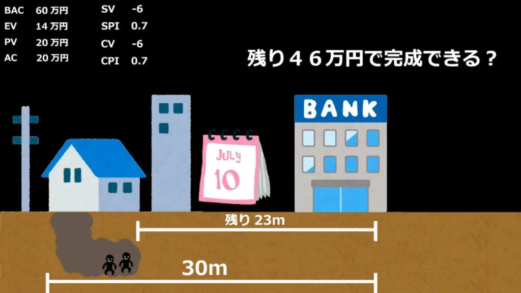 EV(完成した部分の価値)を考えてみましょう。ここまで7mトンネルを掘り終えています。これは1日2万円の人件費を7日かけて掘ることができる長さになります。つまり、出来高は14万円になります。